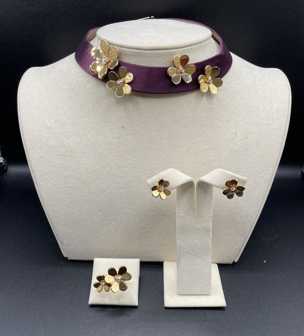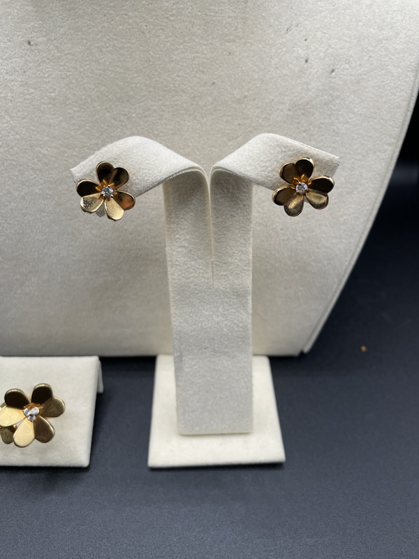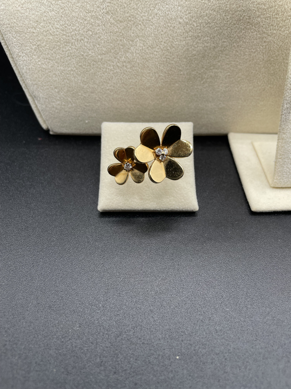 1 BAGUE marquée VCA \"Frivole\" entre doigt -N° BL80473 - 1 COLLIER marqué VCA \"Frivole\" N° BL76909 - 1 PAIRE DE BOUCLES D\'OREILLES marquée VCA \"Frivole\" N° BL108088- (petit modèle) - Or, brillants, tissu, brut: 61,02 grs. Etui + facture |