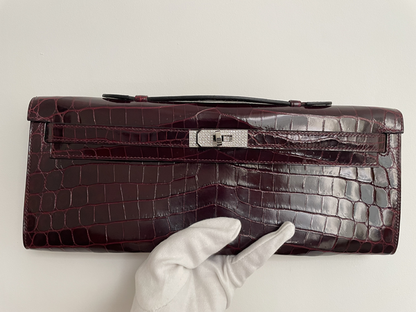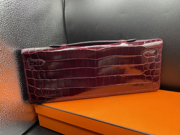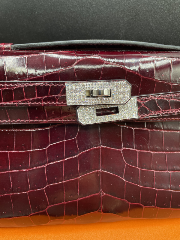 1 SAC marqué‚ HERMES Kelly pochette croco avec un fermoir Or brillants (env: 3,85 ct) Q dans un carré symbole Omega 28 L + Boite |