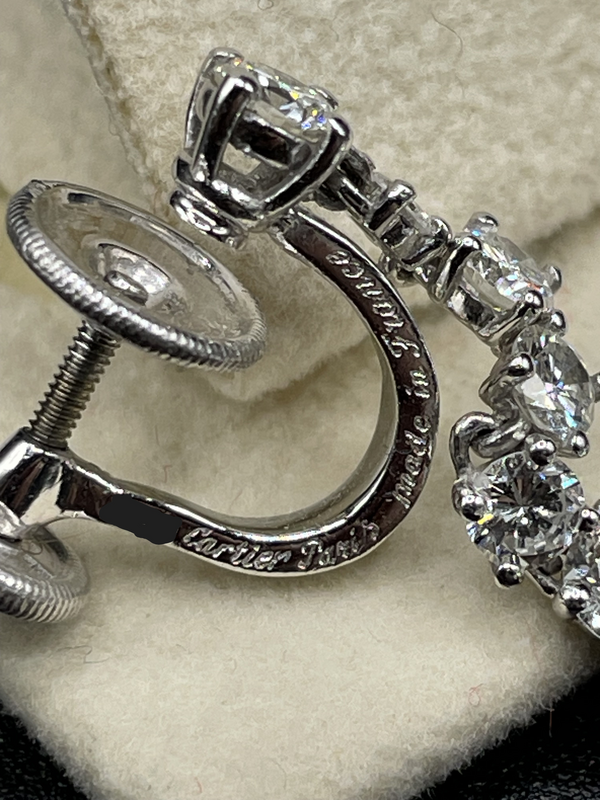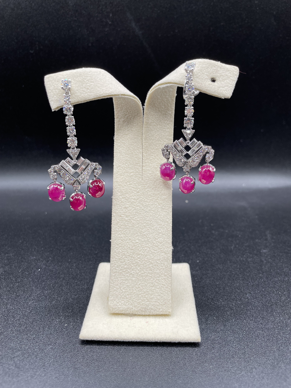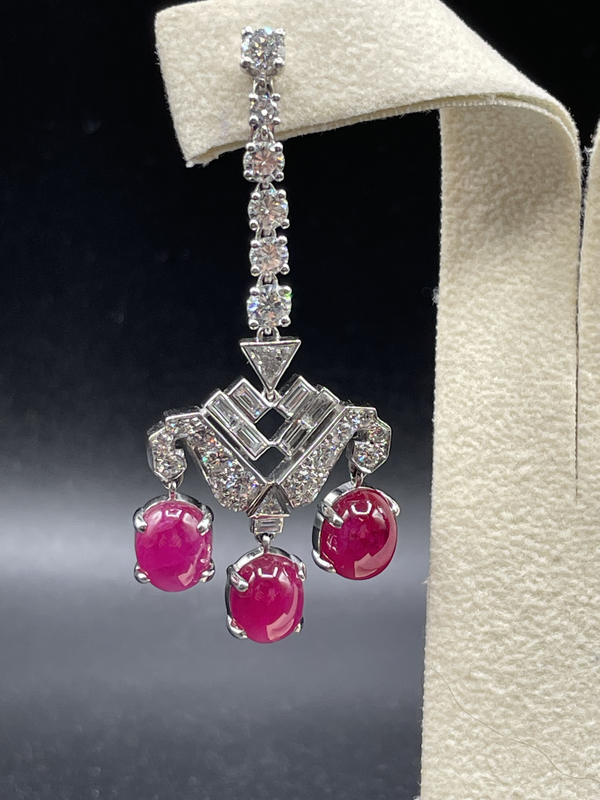 1 PAIRE DE BOUCLES D\'OREILLES Art déco marquée CARTIER Paris en Platine, brillants (env: 4,50 ct) rubis cabochons, brut: 26,18 grs. |