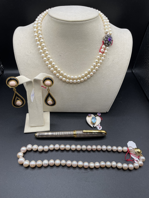 1 PAIRE DE BOUCLES D\'OREILLES Or, pierres, brut: 22,36 grs. 1 COLLLIER PERLES DE CULTURE FERMOIR Or, brillants, brut: 62,66 grs. 1 COLLLIER PERLES DE CULTURE 2 RANGS FERMOIR Or bas, argent, roses, pierre, brut: 72,20 grs. 1 BROCHE Argent, Or, perres, brut: 14,36 grs. 1 STYLO marqué CARTIER métal avec plume Or, brut: 56,60 grs. |