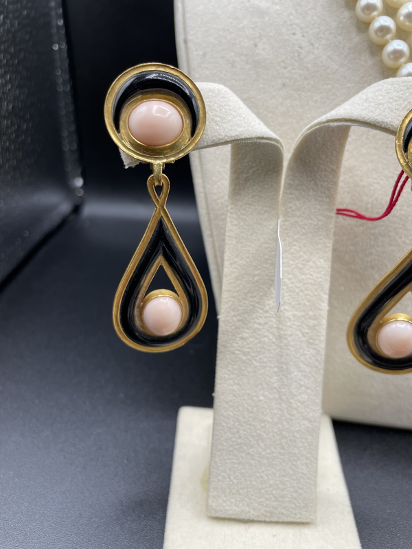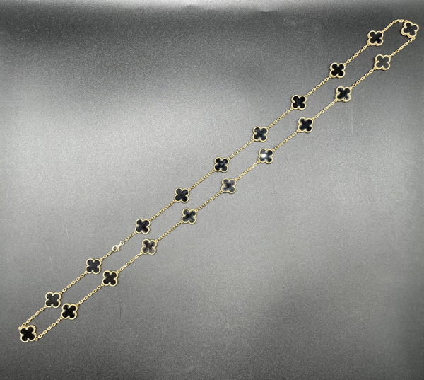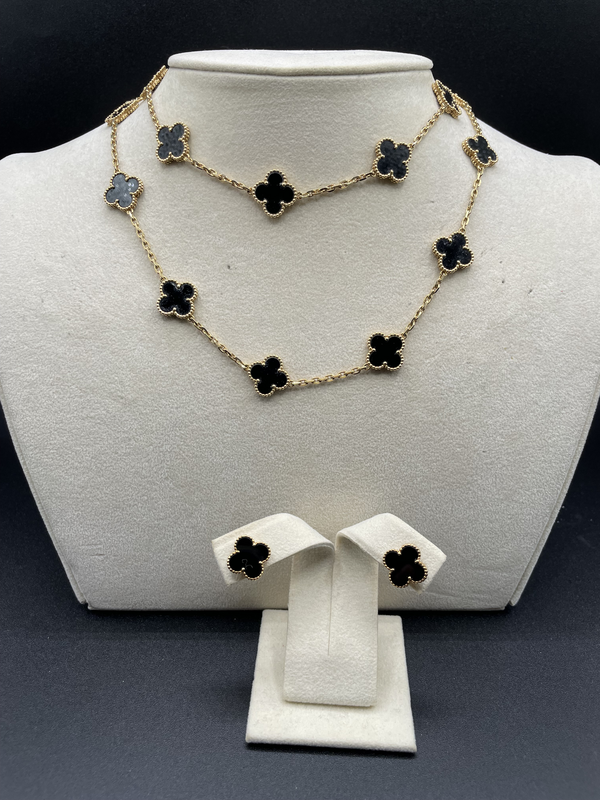 1 SAUTOIR marqué‚ VCA \"Alhambra\" vintage N° CL 112176 - Or, onyx, brut: 46,78 grs - 1 PAIRE DE BOUCLE D\'OREILLES marquée‚ VCA \"Alhambra\" vintage N° CL 106615 Or, onyx, brut: 6,58 grs. |