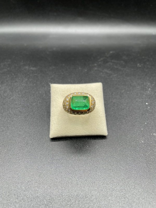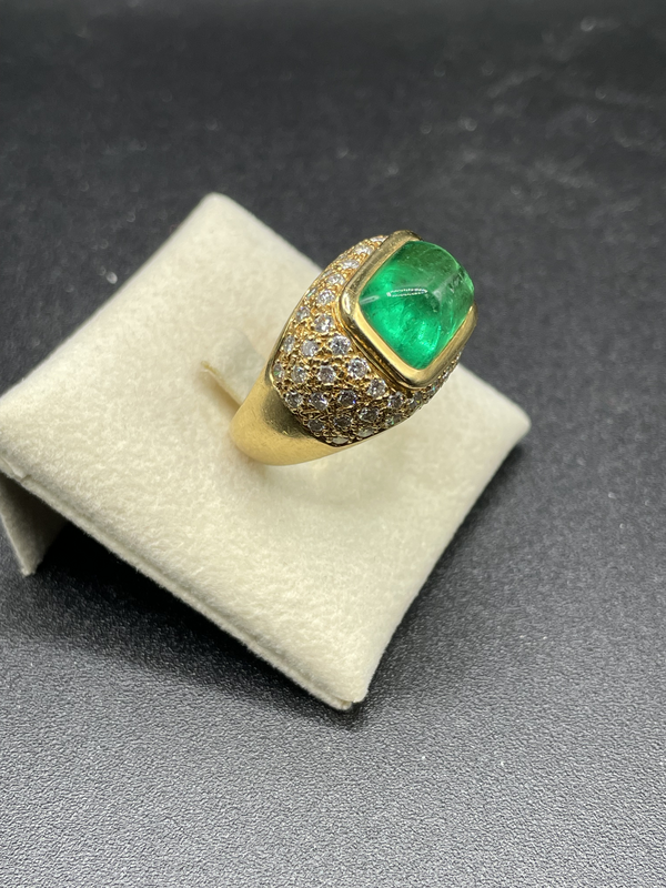 1 BAGUE Or, brillants, (env: 2,00 cts) émeraude cabochon (env: 5,00 cts) égrisures, brut: 12,20 grs. |