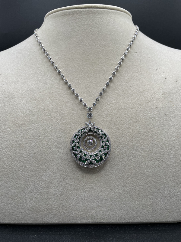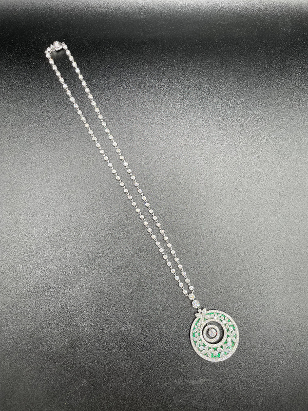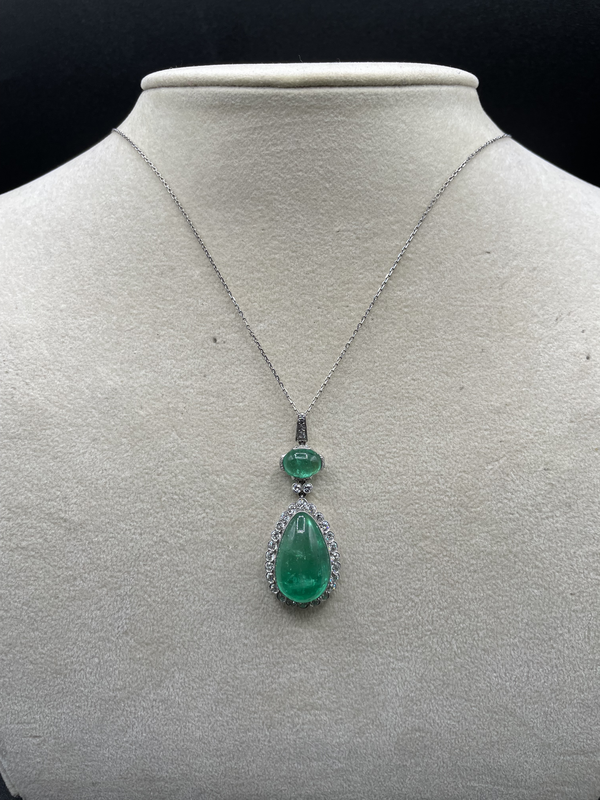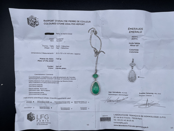 1 COLLIER AVEC 1 PENDENTIF Or, brillants, (env: 1,20 ct) serti de 2 émeraudes de colombie, (centre 21,3 X 13,10 X 9,1 m/m env: 16,90 ct) brut: 9,46 grs. Photocopie rapport d\'analyse LFG (Paris) |