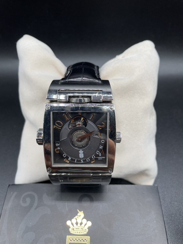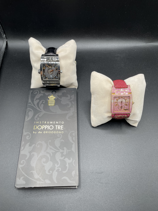 1 MONTRE marquée de GRISOGONO \"instrumento doppio\" Or, brillants sur bracelet cuir, brut: 149,06 grs. 1 MONTRE marquée de GRISOGONO \"instrumento doppio\" Acier sur bracelet cuir, brut: 182,18 grs. + 1 Garantie |