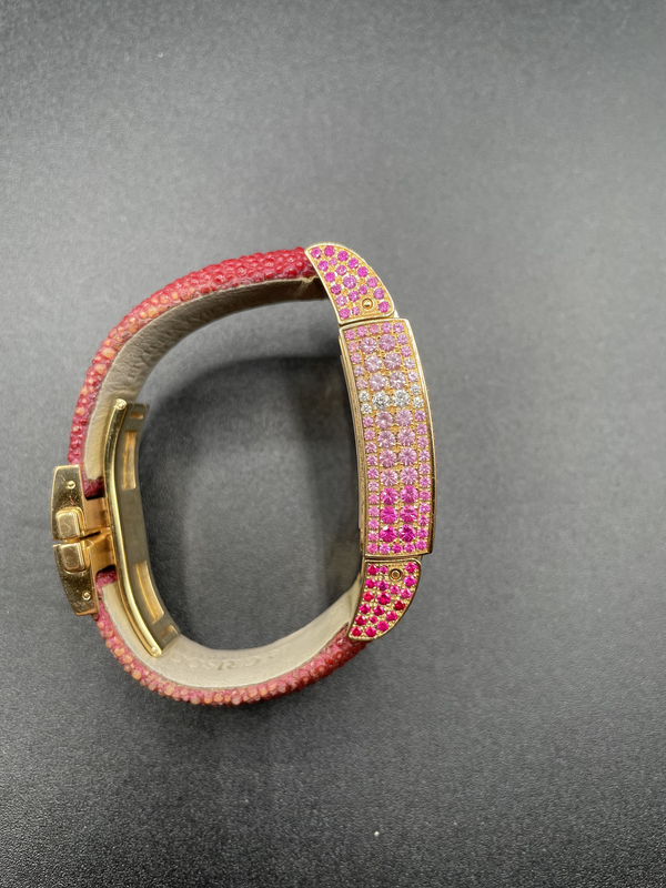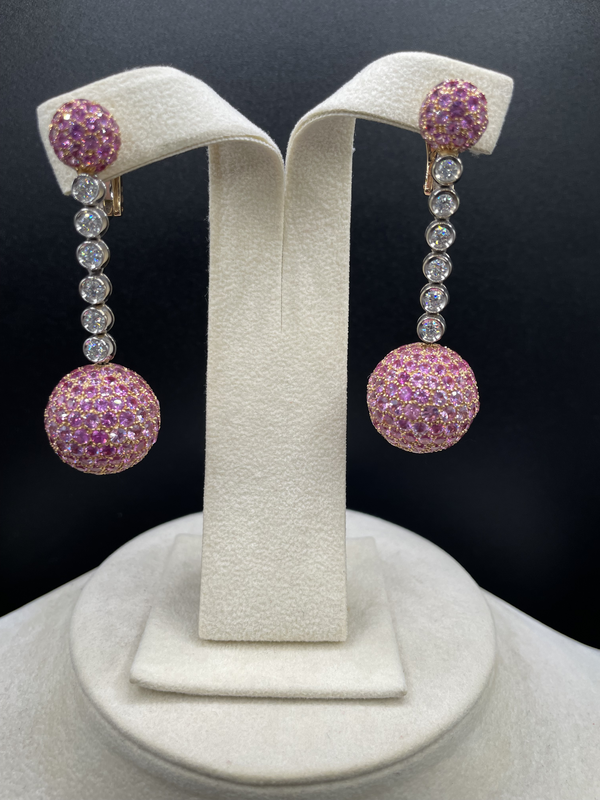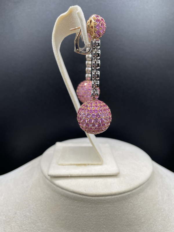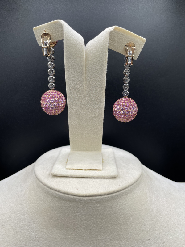 1 PAIRE DE BOUCLES D\'OREILLES marquée de GRISOGONO N° B55521 - Or, brillants (env: 1,25 ct) saphirs rose (en: 30 cts) brut: 44,02 grs. |