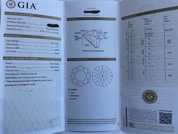 1 BAGUE Or, brillant (3,01 ct - F*/VVS2) Treated color - brut: 5,10 grs. Certificat GIA |