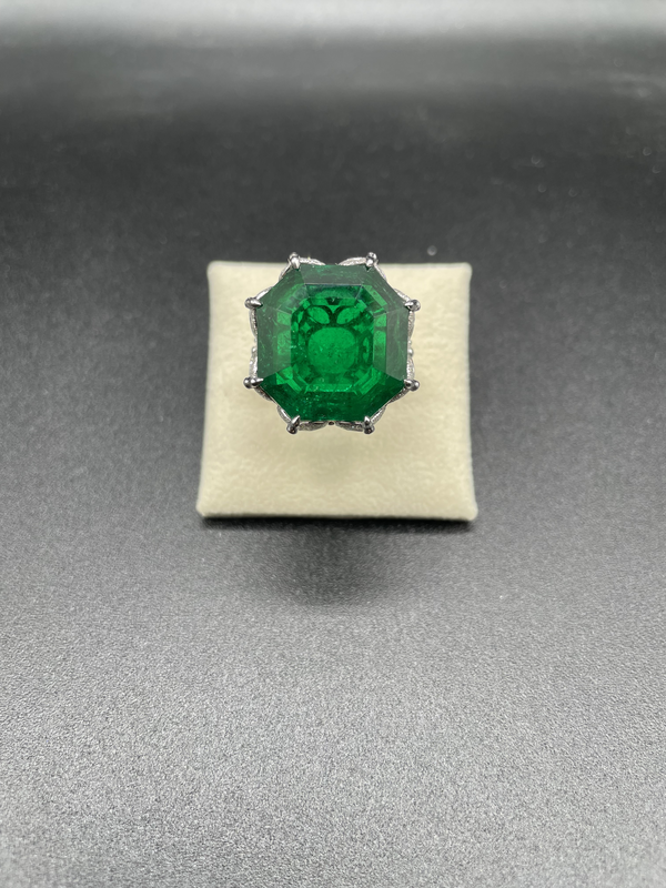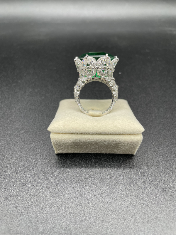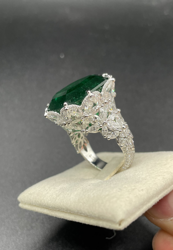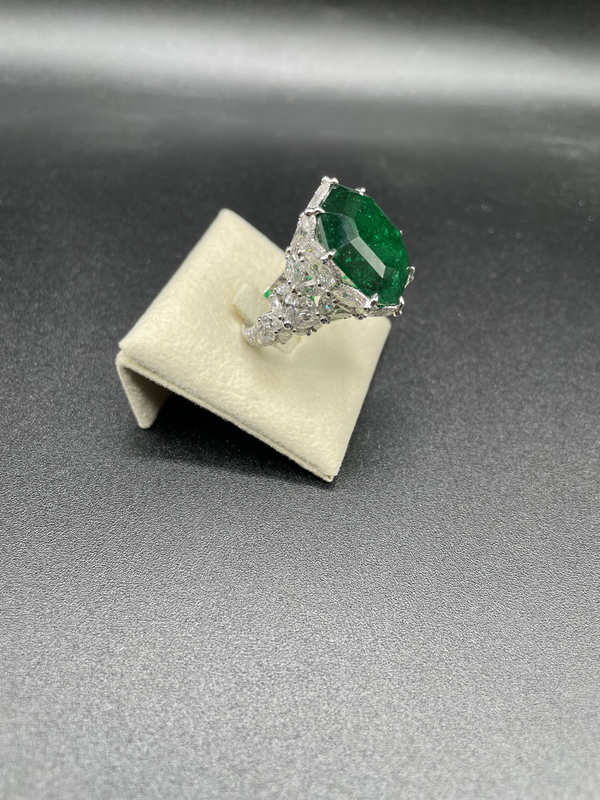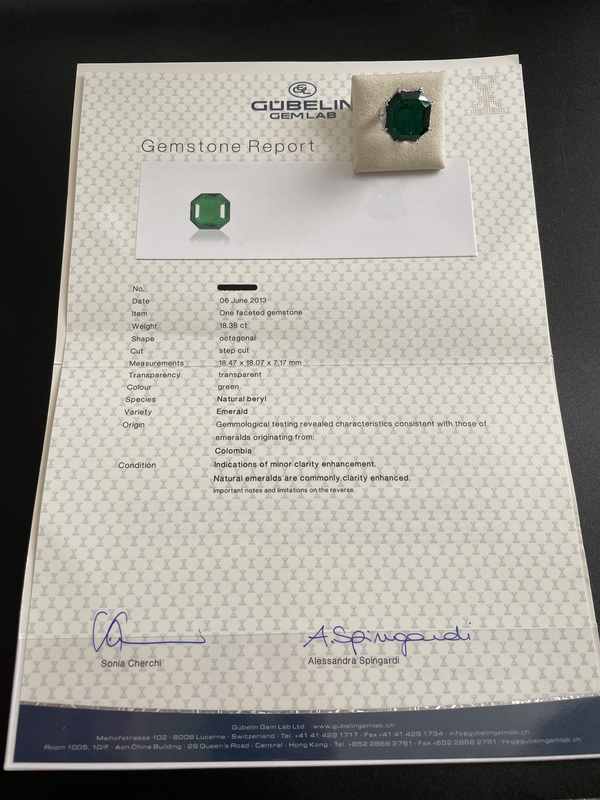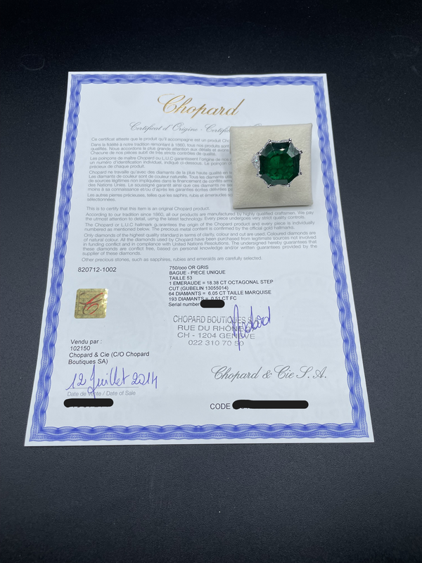1 BAGUE marquée CHOPARD (pièce unique) sertie d\'une émeraude de colombie octogonal step cut indications of minor clarity enhancement pesant 18,38 ct (certificat Gubelin N° 13055014) et de 64 diamants (env: 6,54 ct) taille marquise et 193 diamants (env: 0,51 ct) N° 3373126 - Or, brut: 13,42 grs. Doigt 53 |