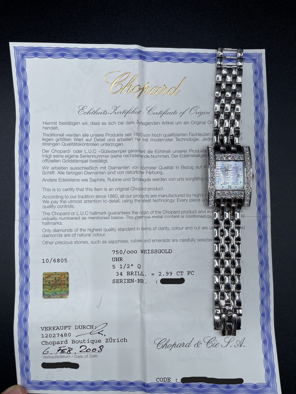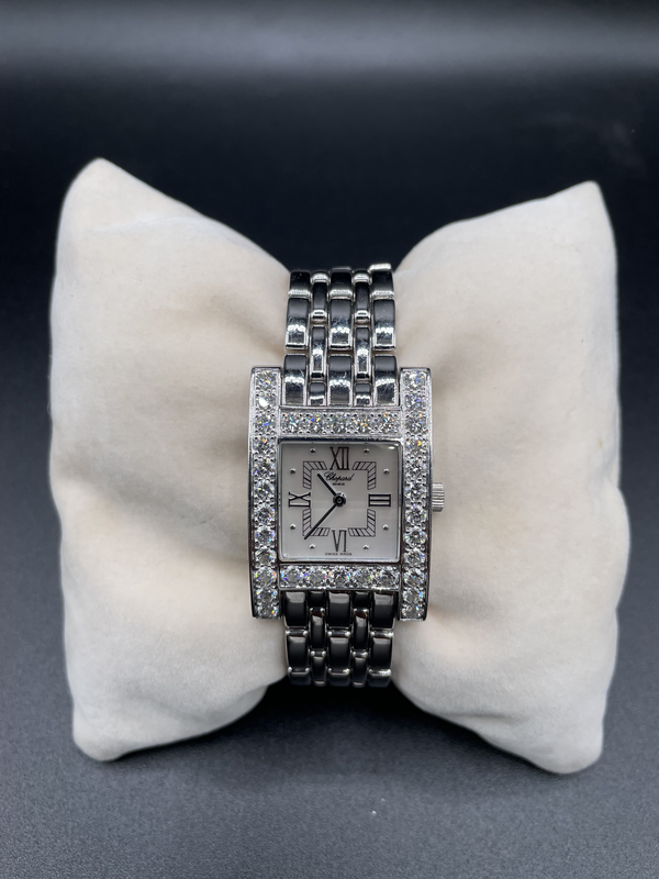 1 MONTRE marquée CHOPARD \"Your Hour\" ref: 106805 - Or, brillants, (env: 2,95 ct), nacre, brut: 93,52 grs. + Garantie |