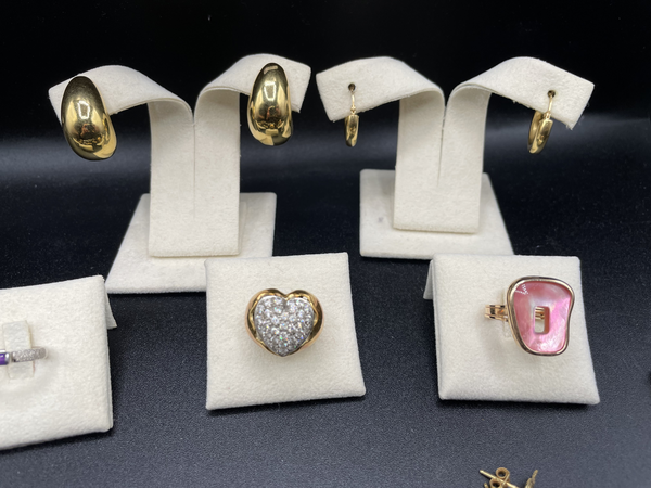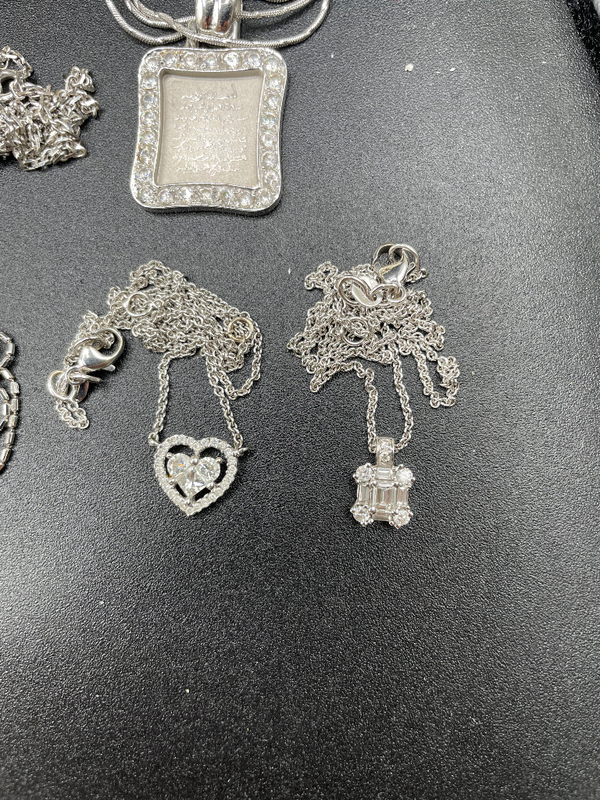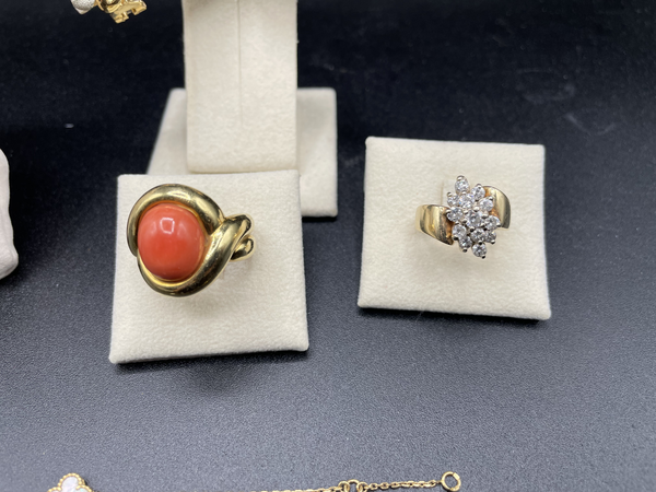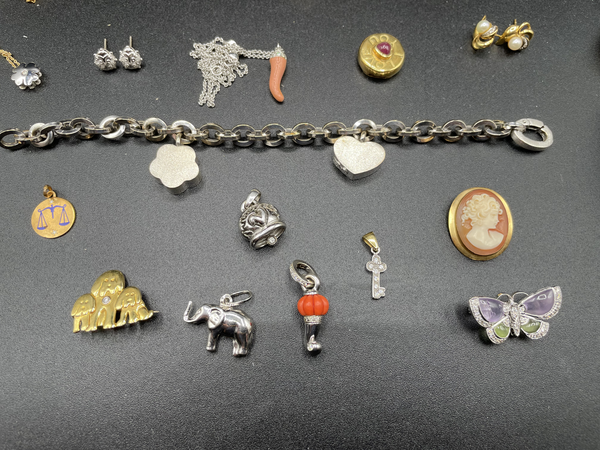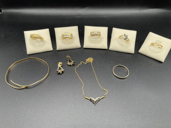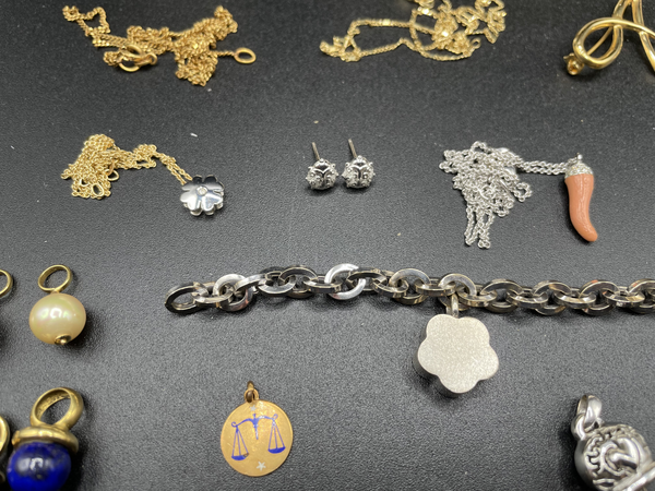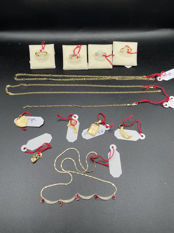 2 BAGUES 1 BRACELET 3 COLLIERS 1 CROIX 4 PENDENTIFS 2 ALLIANCES Or, Or bas, brillants, pierres, brut: 43,70 grs. |