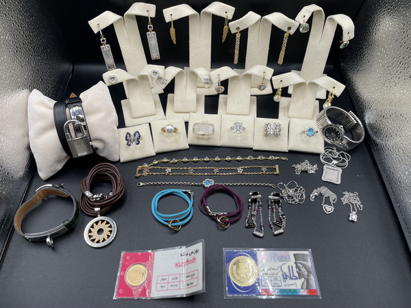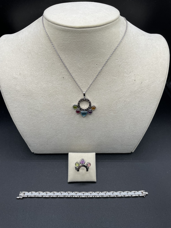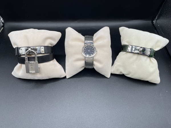 1 MONTRE marquée Bulgari Tubogas 1 MONTRE marquée Kelly Lock 6 COLLIER DONT 1 Bulgari avec 1 PENDENTIF marqué Bulgari Tondo soleil 2 pendentifs 5 BRACELETS DONT 2 marqués Cartier 6 BAGUES DONT 1 marquée Repossi manque des pierres 1 PAIRE DE BOUCLES D'OREILLES marquée Chopard |