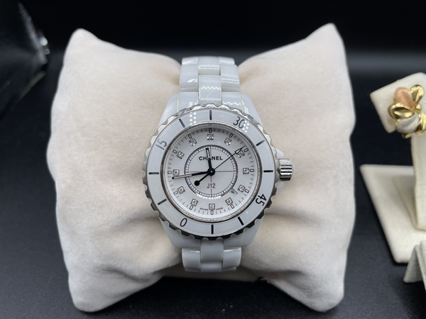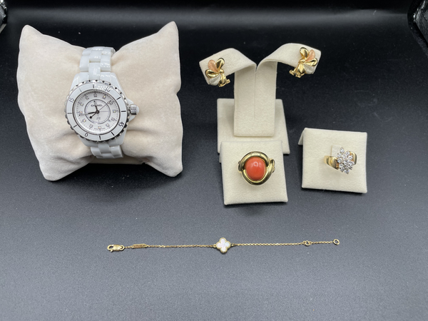 2 BAGUES 1 BRACELET 1 PAIRE DE BOUCLES D'OREILLES Or, Or bas, brillants, pierres, brut: 30,60 grs. 1 MONTRE marquée Chanel J-12 céramique blanche, Acier, brillants, + 2 maillons, brut: 96,42 grs. |