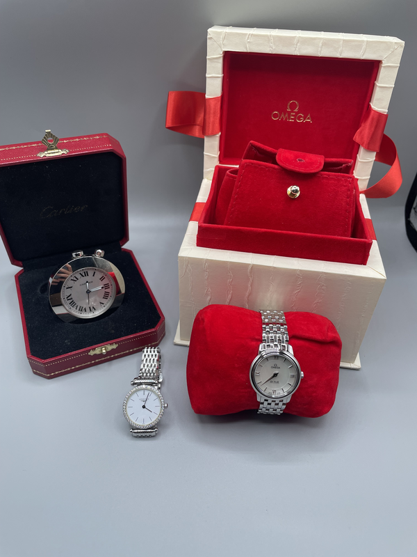 1 MONTRE marquée Omega de ville 1 MONTRE marquée Longines 1 Reveil marqué Cartier Acier, brillants, brut: 187,88 grs. 2 Boites + 1 Garantie. |