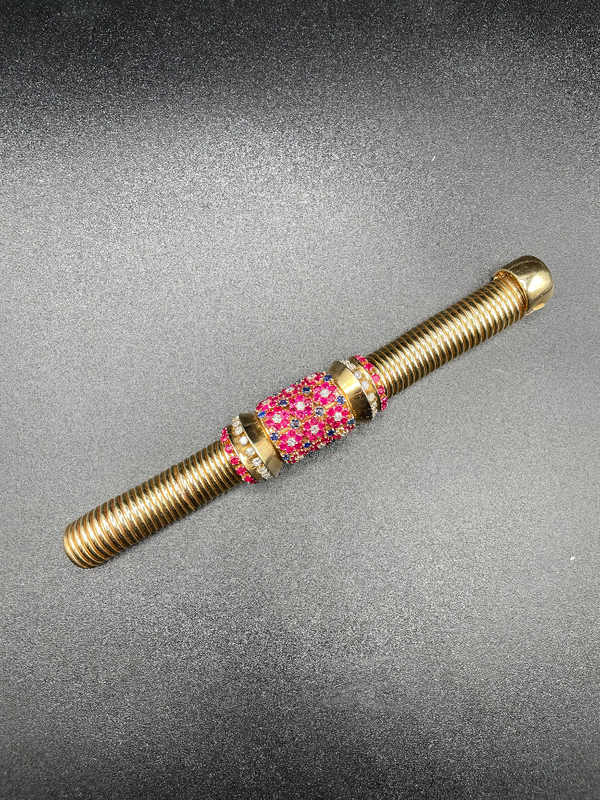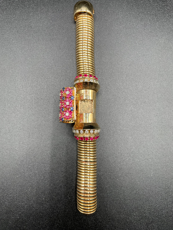 1 MONTRE VINTAGE TUBOGAZ TRANSFORMEE EN BRACELET, Or bas, brillants, (env; 3 cts) rubis, manque 1 rubis, brut: 95,36 grs. |