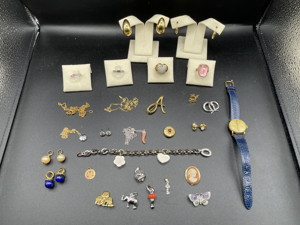 4 BAGUES 1 BRACELET 4 BROCHES 4 COLLIERS DONT 1 FERMOIR CASSE 1 MOTIF 6 PAIRES DE BOUCLES D'OREILLES 9 PENDENTIFS DONT 2 marqués Chanteclair Or, brillants, pierres, brut: 111,96 grs. 1 MONTRE Or, cuir, brut: 15,50 grs. |